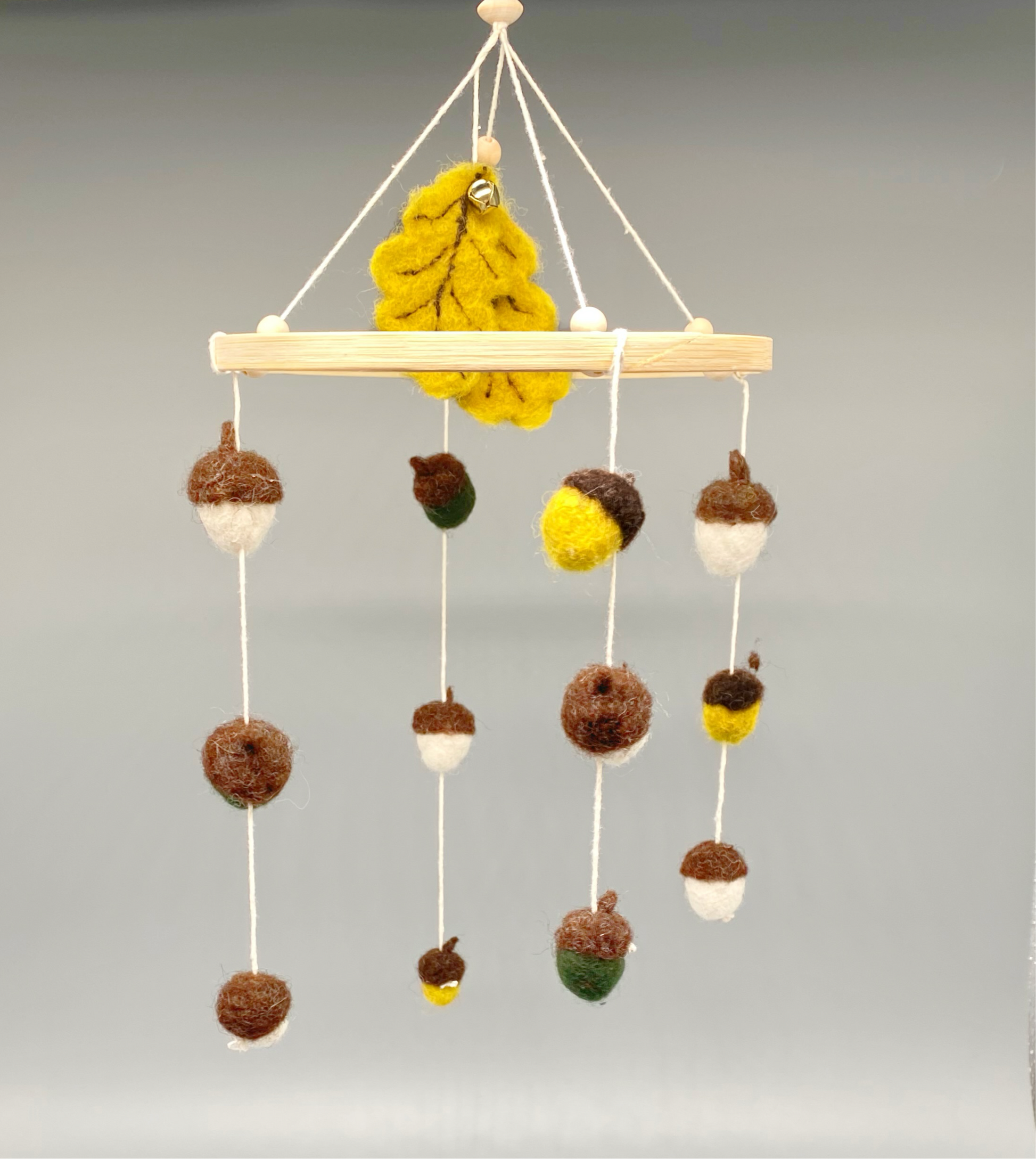 Handtovad babymobil med ekollon i färgerna naturvit, gul och mörkgrön. Ekbladen har en bjällra som skapar ett mjukt behagligt ljud