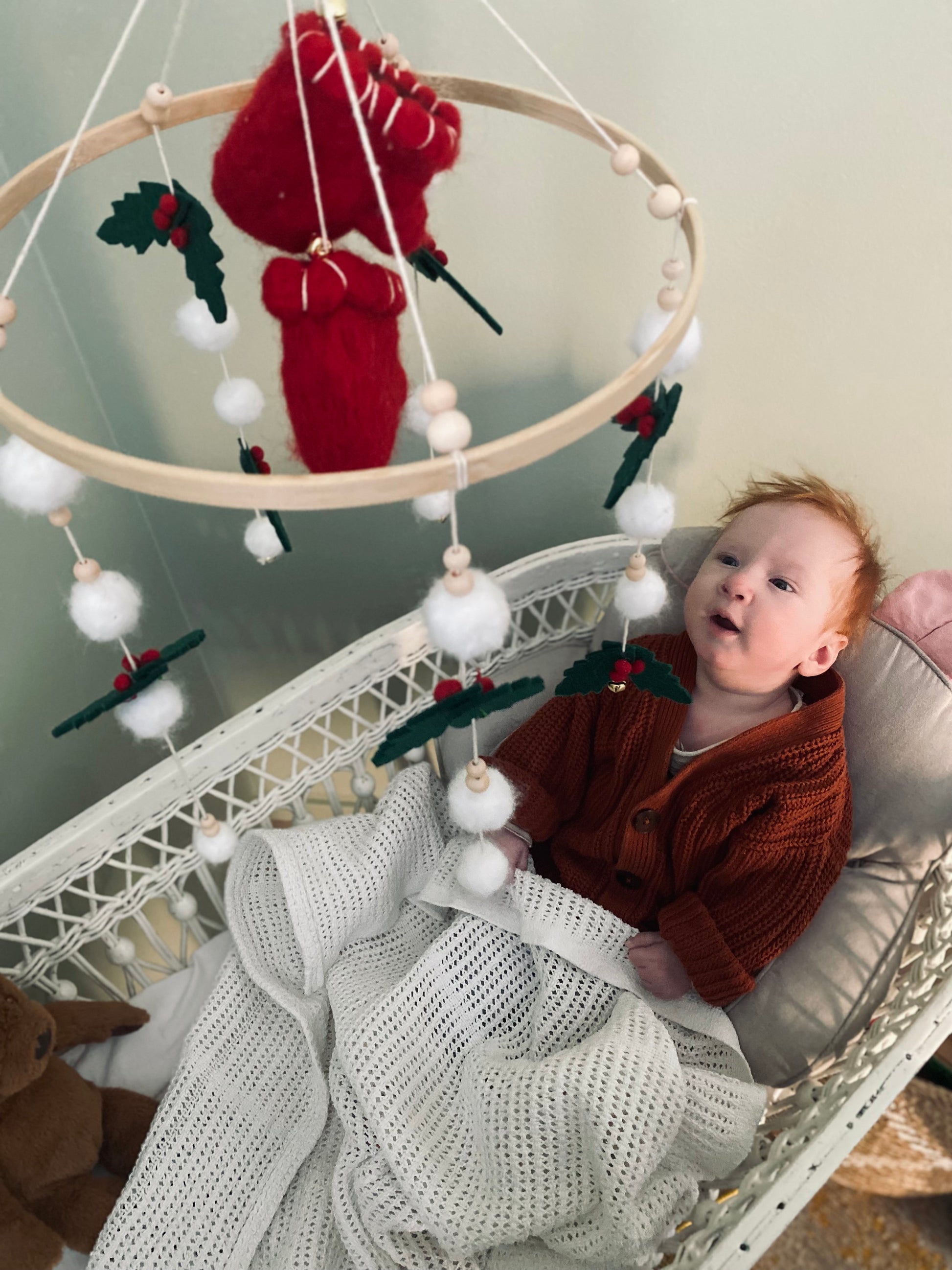 Handgjord babymobil av oss på Storkposten. Tovad i 100% äkta lammull med inspiration från en kall och härlig vinterdag.
