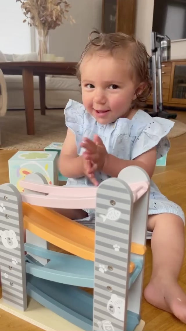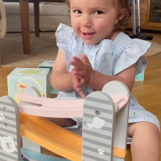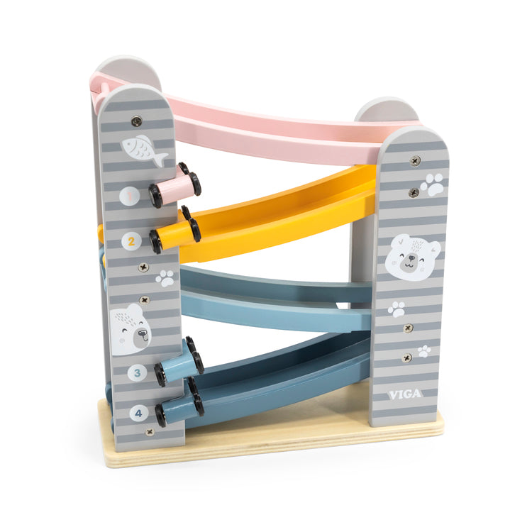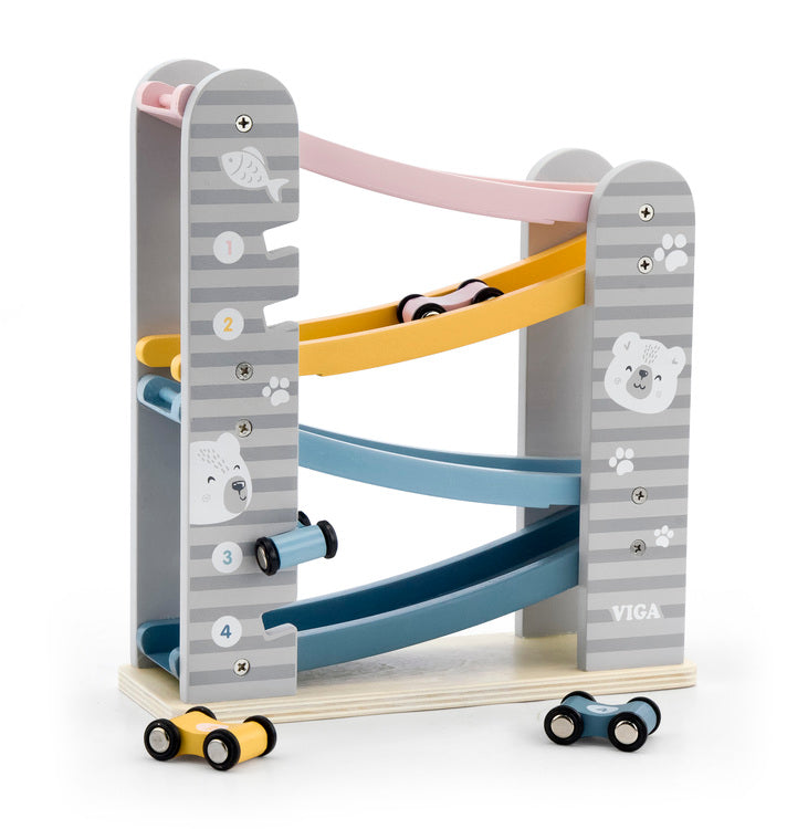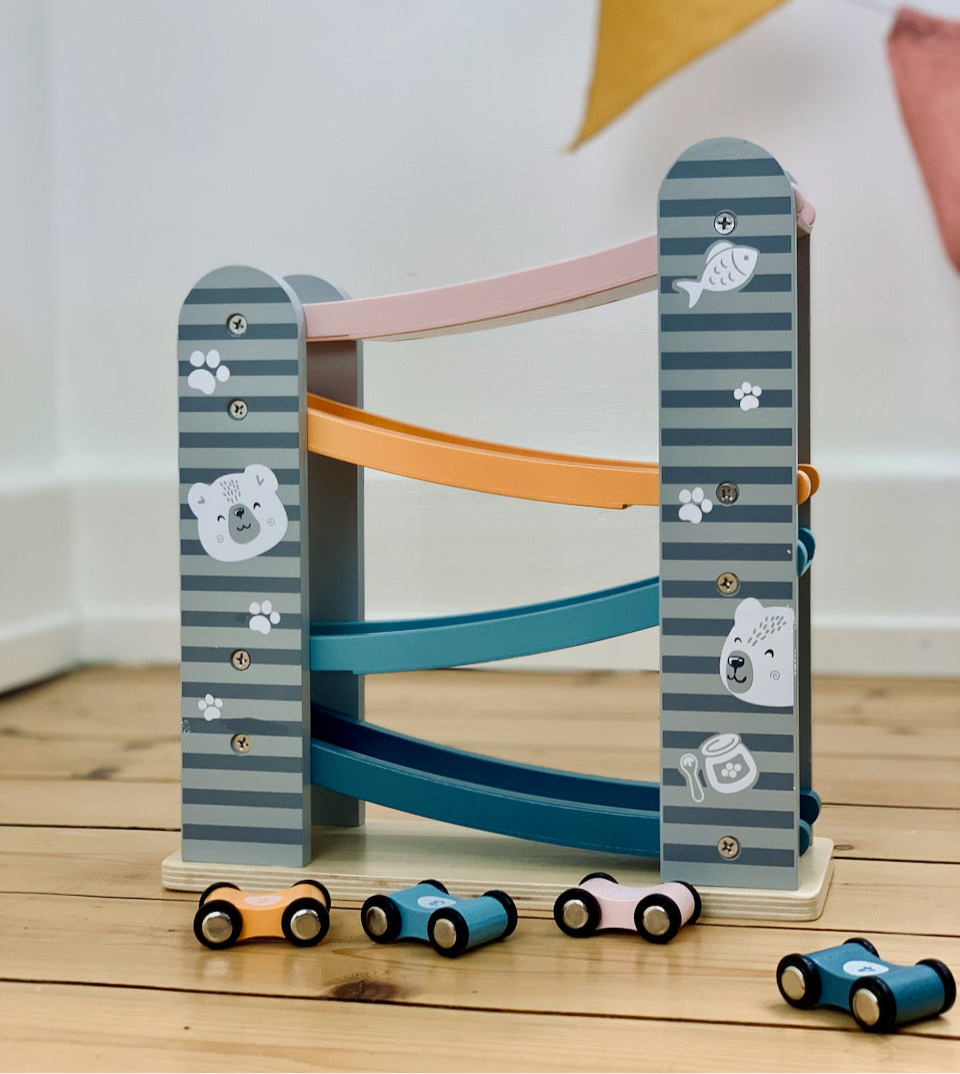 Denna träslider kommer med medföljande racerbilar som åker hela vägen ner för banan när man släpper dem från toppen. Bilbanan kommer i neutrala och behagliga färger.